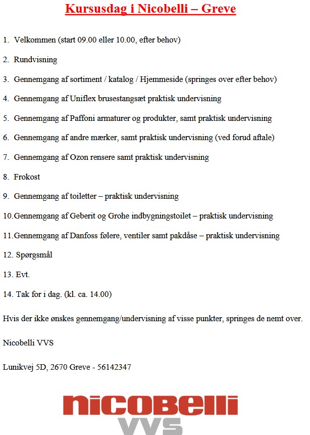 Nicobelli VVS tilbyder alle kunder at de kan komme på besøg hos Nicobelli VVS i Greve til en kursusdag.